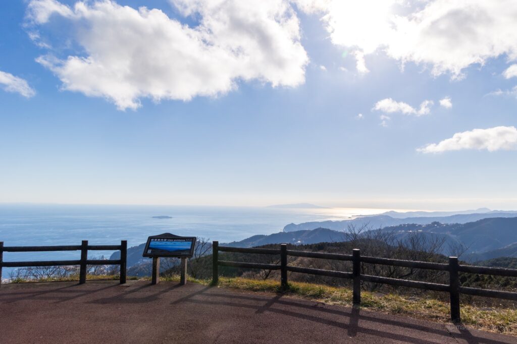 水平線が続く相模湾に初島や伊豆大島まで見えるという絶景スポットは、伊豆スカイラインにある小さな駐車場だ。小さな駐車場からもこの絶景を見ることができるのは、さすが絶景の宝庫である伊豆スカイラインだ。 -