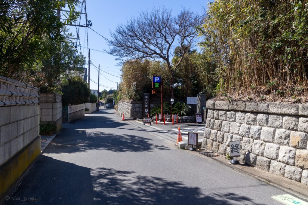 道中は走行しやすい道が続きますが、国道134号から住宅街に入り、そこから公園手前200メートルほどは狭い道が続きますので、車両のすれ違いには注意が必要です。