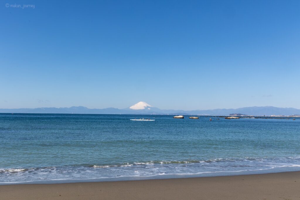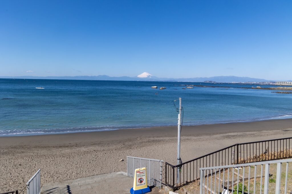 この葉山から富士山までは直線距離で約75キロメートルもあるのにこの富士山の大きさは、さすが日本一の山である富士山だと感じます。