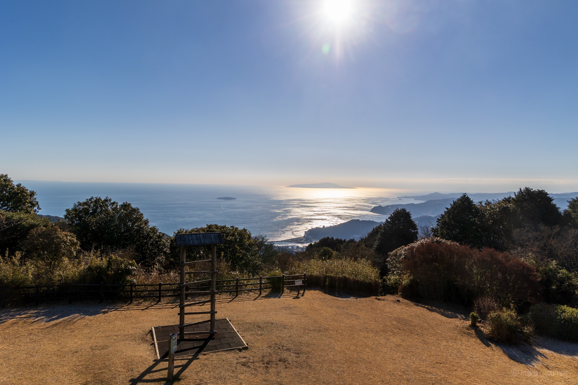 相模湾の先には初島や伊豆大島を見ることができ、右側の山々は伊豆半島の山々もはっきりと見ることができます。