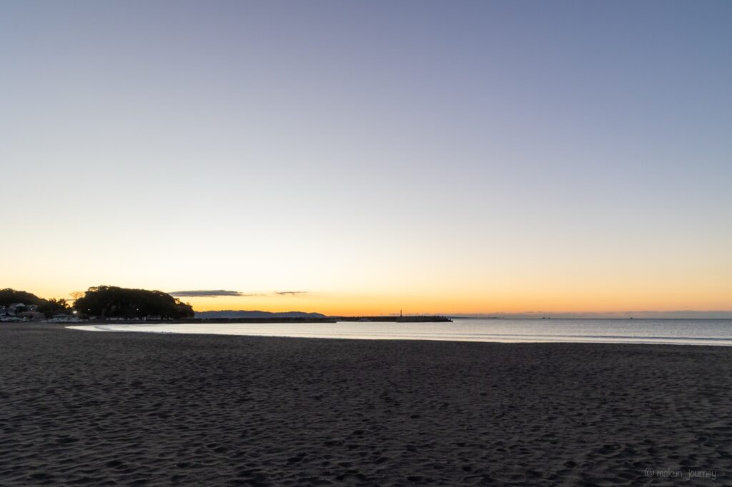 さて、今回のドライブ旅の目的でもある、片瀬東浜海水浴場の日の出ですが、まず日の出少し前の様子はこちらです。