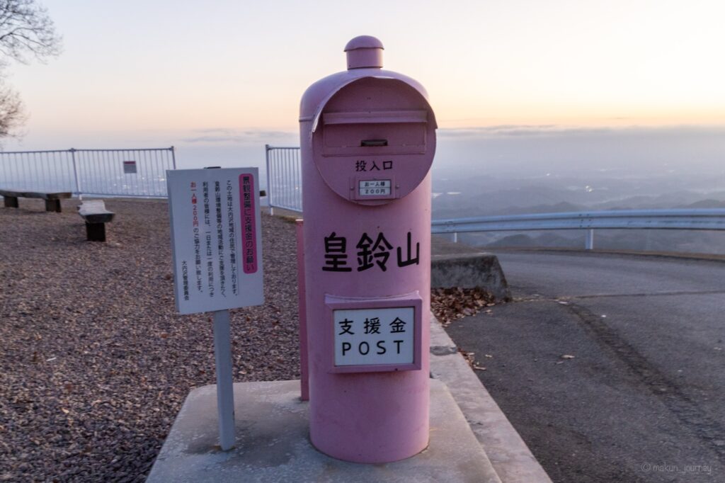 さて、この素晴らしい絶景を見ることができる皇鈴山展望台ですが、実は有志の方々が守り抜いている展望台とのことで、このように支援金ポストが設置されていました。
