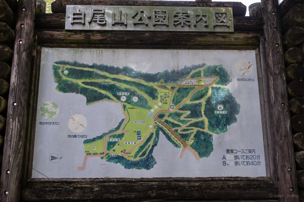 白尾山公園の駐車場は2箇所あります。展望台と芝生広場が目的の方は、下の園内マップのもう一箇所の駐車場を利用してみるのも良いと思います。