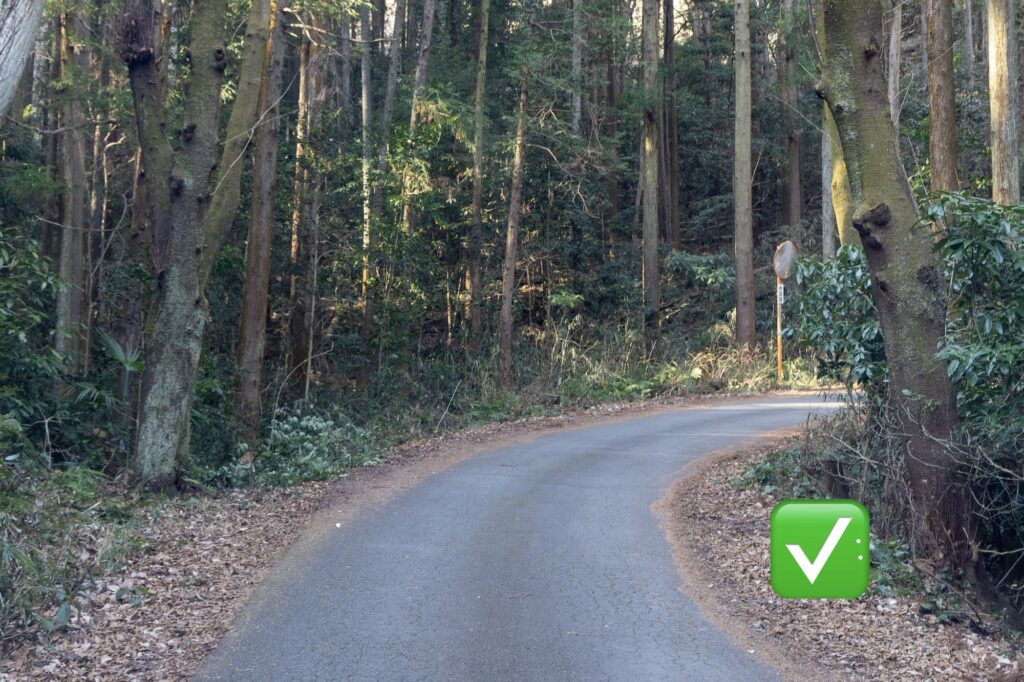 ただ、到着直前500メートルぐらい(感覚的にですが)は狭い道を通行することになるため運転には注意が必要です。また、狭い道であるがゆえに、この道であっているのか不安になることがありますので、事前にイメージをお伝えします。