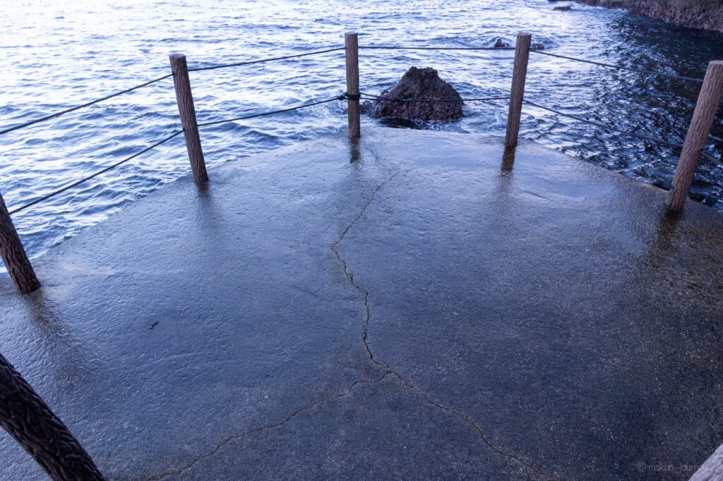 この展望地は、波が少しかかっているようで、足元が濡れていたので滑ったり濡れたりしないように注意が必要です。