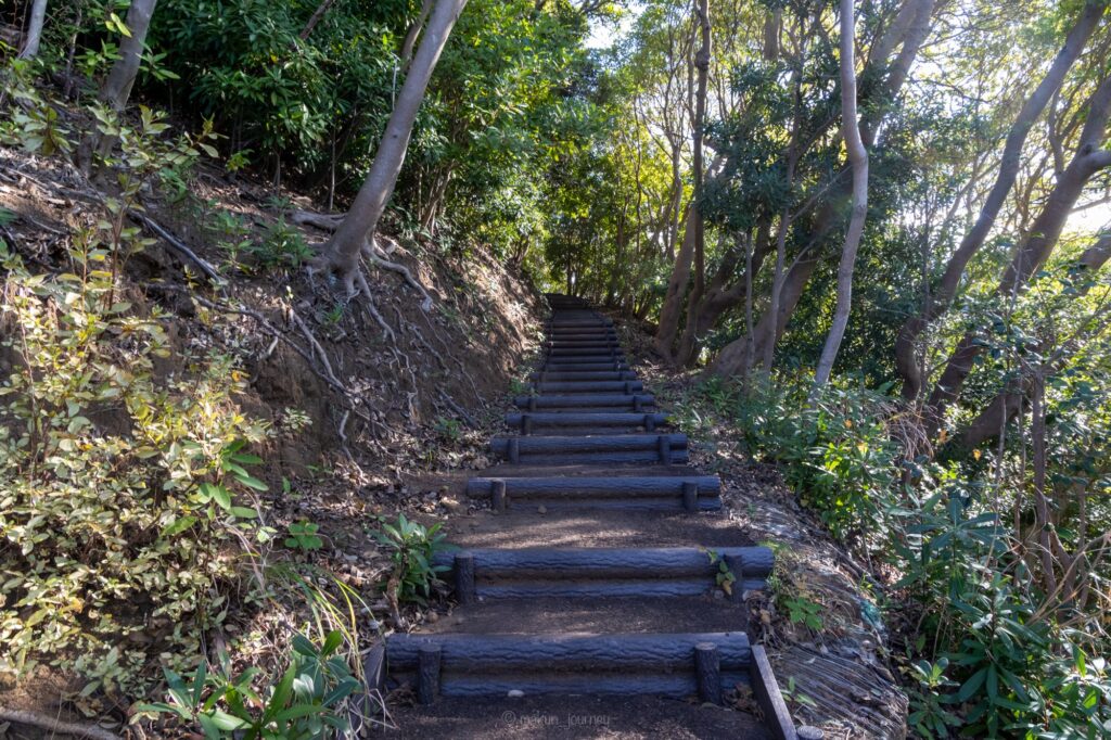 登山道といっても階段が整備されているため、歩きやすいスニーカーであれば問題なく登ることができます。