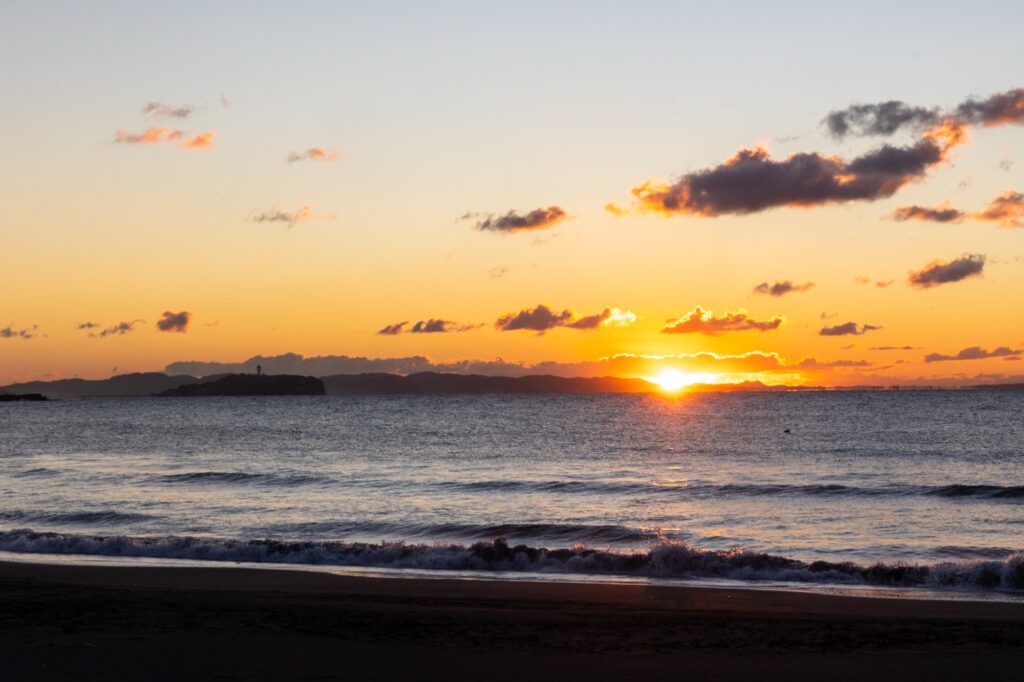これは美しいです。写真左側には江ノ島も見えます。この時ばかりは、江ノ島よりも太陽が主役となっているようでした。