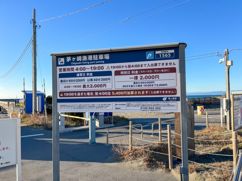 今回は、サザンビーチ横にある有料駐車場の「茅ヶ崎漁港駐車場」を利用しました。