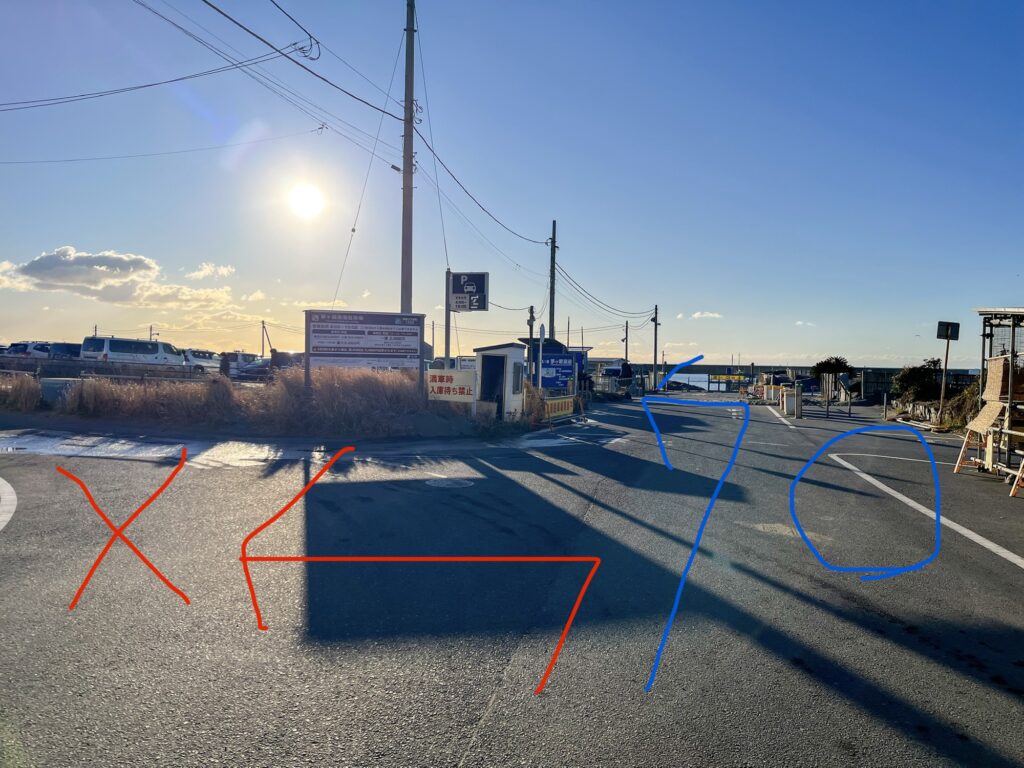 西浜小学校入口の信号を右折し、少し坂を下るとこのようになっていますので、写真の青矢印のように駐車場に入庫します。ここは、少しわかりづらかったので参考にしてください。