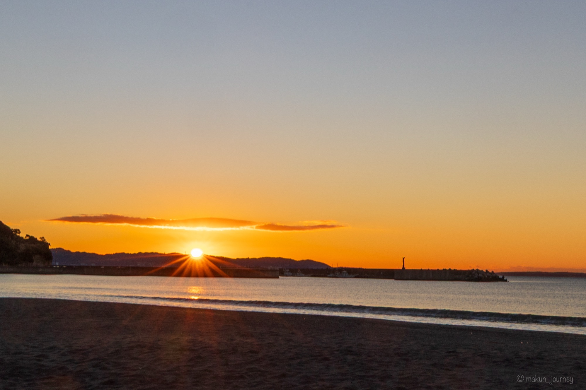 真夏の海水浴場の賑わいとは違い、ほとんど人もいない波の打ち寄せる音がゆったりと聞こえる海岸で、この絶景の日の出をのんびりと眺めることができました。