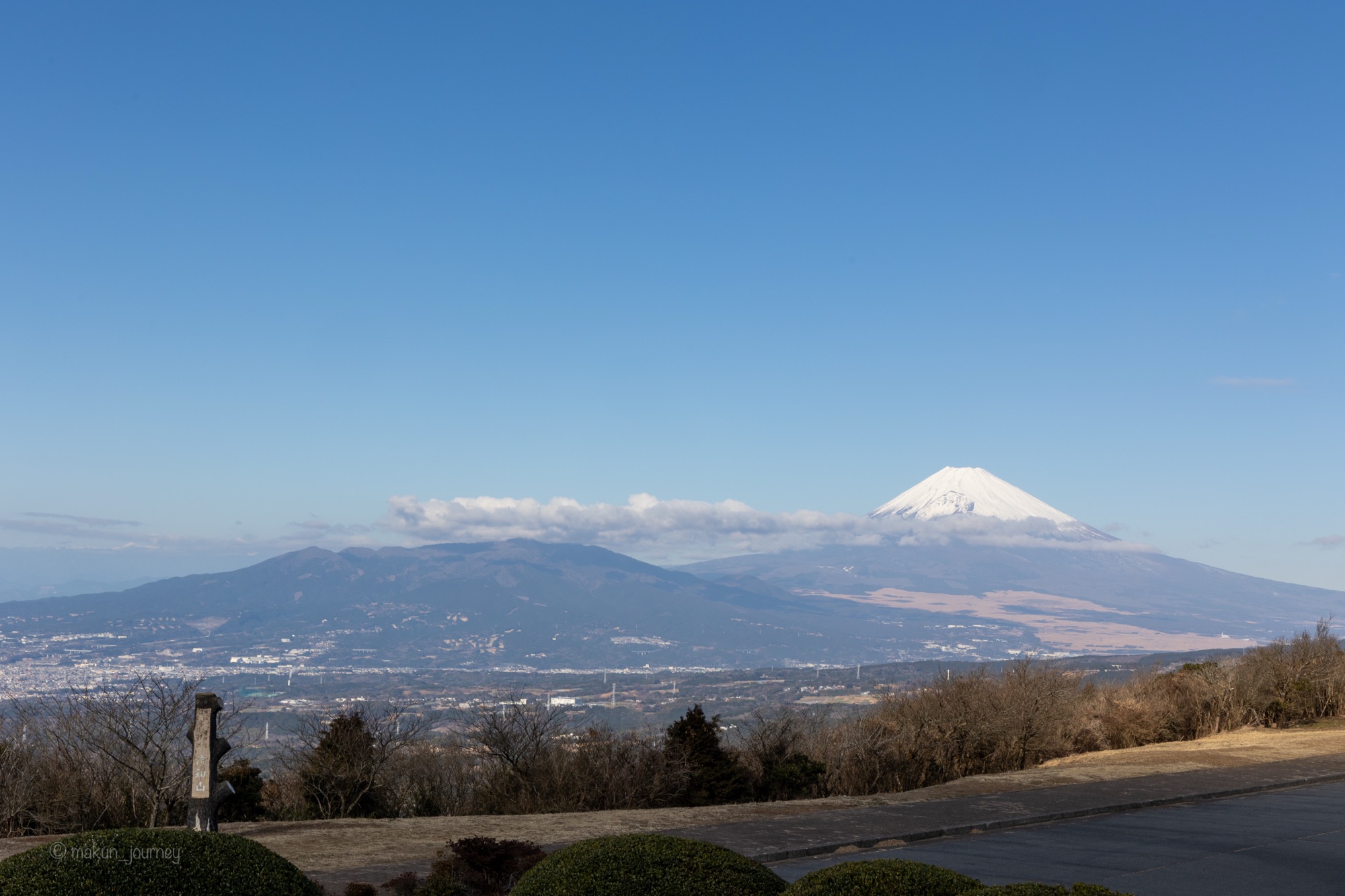 熱海峠側から伊豆スカイラインに入ると、まず初めに向かう絶景スポットとなる「滝知山園地」は、大きな富士山はもちろんのこと、駿河湾や相模湾を望める眺望があり、非常に美しい景色が広がっていました。